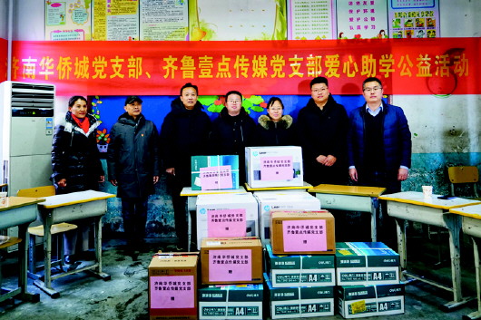 济南华侨城党支部与齐鲁壹点传媒党支部为邢家小学捐献物资。