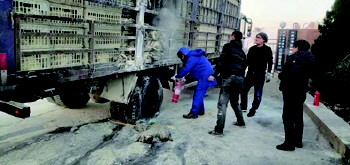 6点10分时,突然有一辆带着火光的大货车停靠在加油站进站口附近,面对突发险情,司机师傅手足无措、惊慌大喊起来“着火了、着火了……”崔石强闻声望去,此时只见大货车侧面浓烟滚滚,且与加油机相距不足200米,崔石强立即提起两具8公斤干粉灭火器冲向着火车辆,同时大声通知了同班员工,切断电源,关闭加油机。