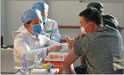 3日,在北京一社区卫生服务站接种点,医护人员为接种人员注射疫苗。新华社发