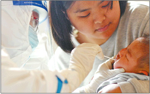 ◥1月12日,石家庄开展全市第二轮全员核酸检测,在元氏县使庄村,工作人员为一名4个月大的孩子进行核酸采样。 新华社发