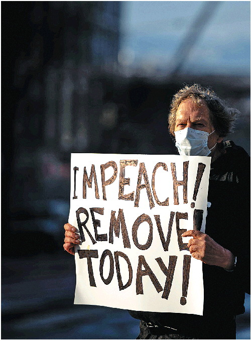 11日,一名男子在美国旧金山手举写有“弹劾、罢免”字样的标语。 新华/法新