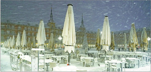西班牙多地近日遭受极端寒冷天气袭击。这是1月8日西班牙首都马德里马约尔广场上的桌椅被雪覆盖。 新华/路透