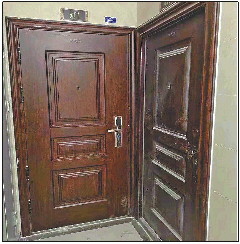 边户外开,中间户内开,两家入户门垂直紧挨,开门“打架”。