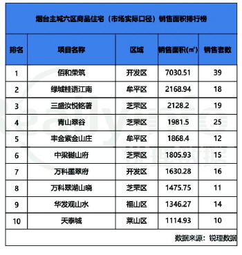 根据锐理数据统计显示,上周(1.11-1.17)烟台主城六区商品住宅开发区佰和荣筑、牟平区绿城桂语江南、芝罘区三盛汝悦铭著跻身销售前三甲。