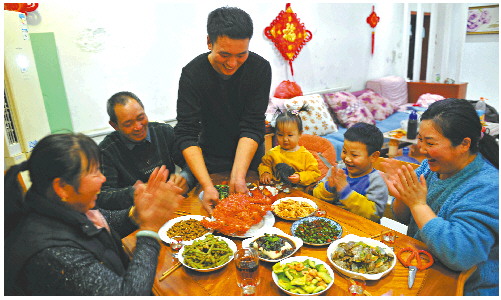 为了这顿年夜饭,小班媳妇从下午2点就开始准备,她的拿手好菜——红烧猪蹄、软炸虾仁等都是年夜饭家人必点的菜。忙忙碌碌这一年,他们最看重的就是这顿年夜饭。“生活要有仪式感嘛!”小班媳妇在厨房里边忙碌边说。饭桌上,一家人举起酒杯,回望过去这几年,不禁感慨万千。