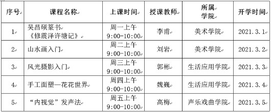 据了解,本季直播大课堂共设置吴昌硕篆书《修震泽许塘记》、山水画入门、风光摄影入门、手工面塑—花花世界、“内视觉”发声法5门课程。每门课程限报1000人(若报名不足100人,则取消招生),实行大班授课、小班管理。2021年3月1日开课,每周授课1次,每次1小时,共16次课,授课至今年6月份结束。