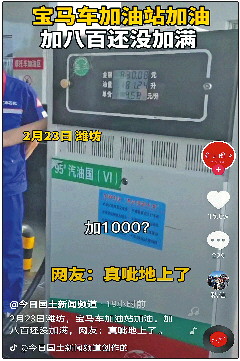 24日,一段视频在各大视频平台上被疯狂转载,视频被剪辑成各种风格版本,但核心内容基本一致。视频显示,2月23日,在山东潍坊的一个加油站内,一辆宝马车正在加油,几名身穿短袖T恤的男子向加油站工作人员发出质问:“什么车能加八百多?”“给我加上一千!”“加不了给我呲地上!”……记者从一闪而过的镜头中看到,当时加油机显示:金额829.99元,油量181.22升,单价4.58元/升。乍一看,确实给人一种无辜车主遇上“黑加油站”的感觉。