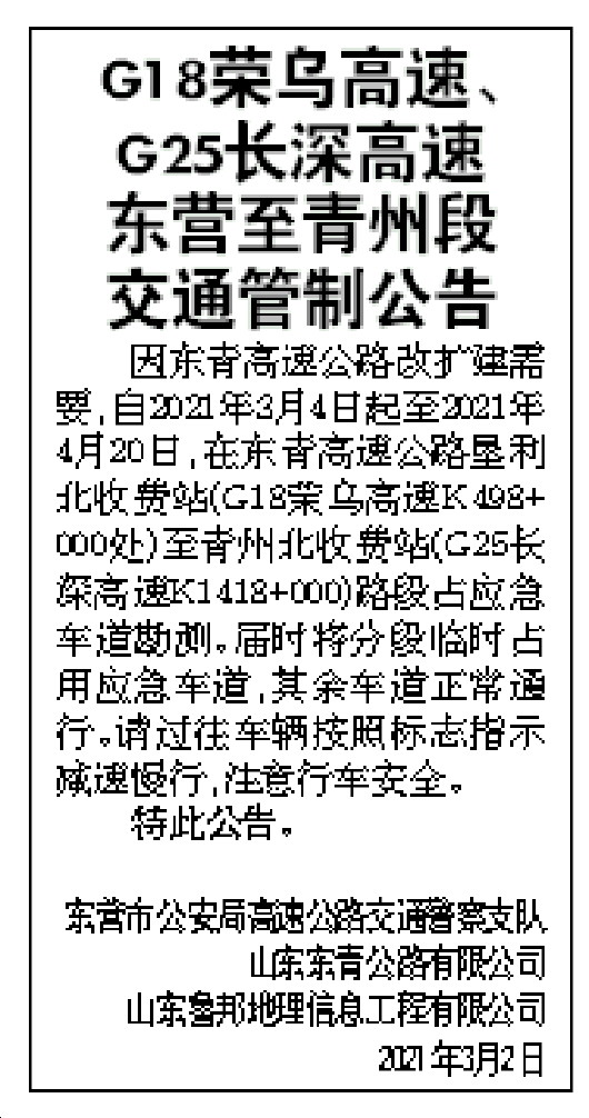 G18荣乌高速、 G25长深高速 东营至青州段 交通管制公告 因东青高速公路改扩建需要,自2021年3月4日起至2021年4月20日,在东青高速公路垦利北收费站(G18荣乌高速K498+000处)至青州北收费站(G25长深高速K1418+000)路段占应急车道勘测。届时将分段临时占用应急车道,其余车道正常通行。请过往车辆按照标志指示减速慢行,注意行车安全。 特此公告。 东营市公安局高速公路交通警察支队 山东东青公路有限公司 山东鲁邦地理信息工程有限公司 2021年3月2日