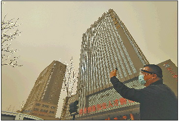 15日下午,德州市被黄沙笼罩,整个城区的能见度下降。