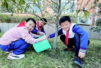 永宁路小学同学们给树木浇水。