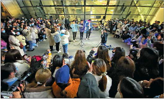 晴好天气又恰逢周末,济南最高气温达15℃,市民外出踏青游玩热情高涨。老城区因天气回暖,也重现往日热闹景象。20日晚上9点半,记者在芙蓉街看到,夜经济正快速升温,往日烟火气重现。人头攒动,以年轻人为主力的“吃货”大军们又开启了“逛吃逛吃”模式。而在曲水亭街、百花洲等地,不少市民正在悠闲散步,享受难得的周末休闲时光。 图为泉城路恒隆广场外,街头艺人精彩的演唱受到不少市民的喜爱。 齐鲁晚报·齐鲁壹点记者 王鑫 摄影报道