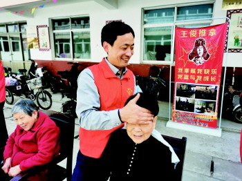 王俊带领盲人按摩师为老人们义务按摩。