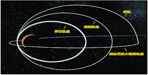 天问一号探测器到达火星后开展了一系列复杂的变轨操作。2021年2月10日,探测器第一次到达近火点时进行捕获制动,成功实现火星环绕,进入周期为10天的大椭圆轨道;2月15日,探测器第一次到达远火点时进行变轨,调整轨道平面与近火点高度,环火轨道变为经过火星南北两极的极轨;2月20日,探测器第二次到达近火点时进行制动,进入周期约为4天的调相轨道,使其在运行一圈再次到达近火点附近时,能够正好经过预定着陆区上空。