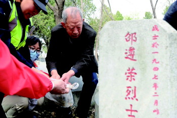 4月1日上午,邵志道在昌邑饮马烈士陵园邵遵荣烈士的墓前深深三鞠躬,他把从家乡带来的特产摆在墓前祭奠爷爷,并在烈士墓周围撒下了家乡的泥土。