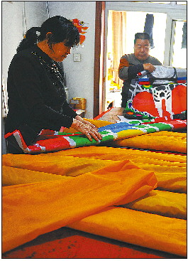 4月7日,在济南紫金山小区庞曰龙家中,老两口一边给一只巨型的风筝上色,一边讨论着。这只造型为凤凰的风筝长约20米、宽约5米,他们准备做好了拿到潍坊国际风筝节上去放飞。