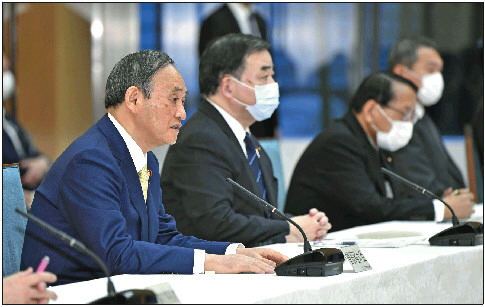 4月13日,日本首相菅义伟(左一)出席内阁会议。 新华社/共同社