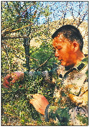 巡山过程中,杨西路检查赤松是否有病虫害。