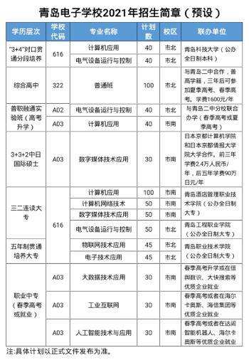 2021年,学校计划招收720人。其中与青岛科技大学合作的3+4本科80人,与青岛二中合作的综合高中100人,与青岛二中分校合作的普职融通80人,与青岛酒店管理职业学院合作的三二连读大专200人,与青岛工程职业学院合作的三二连读大专50人,与青岛职业技术学院合作的五年制贯通培养90人,3+3+2中日硕士30人,职业中专三个专业共招收90人。