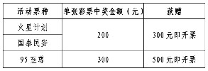 活动期间,购彩者凡在我省体彩销售网点购买10元“火星计划”“国泰民安”或30元“95至尊”任一顶呱刮游戏,单张彩票中得指定金额奖级,经销售网点兑奖终端设备完成兑奖后,可获赠指定价值的即开票,具体活动内容如下: