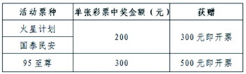 活动期间,购彩者凡在我省体彩销售网点购买10元“火星计划”、“国泰民安”或30元“95至尊”任一顶呱刮游戏,单张彩票中得指定金额奖级,经销售网点兑奖终端设备完成兑奖后,可获赠指定价值的即开票,具体活动内容见图表。