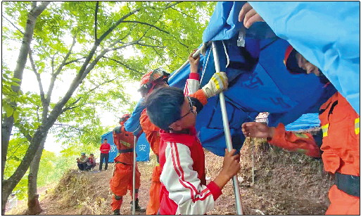 5月22日,在云南漾濞地震灾区,一名学生帮助消防官兵搭建救灾帐篷。 新华社发