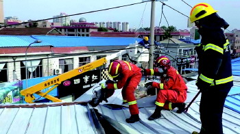 风力变小之后,消防员两人一组,携带无齿锯,爬上楼顶对悬空彩钢瓦进行切割、分解并转移至安全地带。经过一个小时的奋战,彩钢瓦被全部拆除。