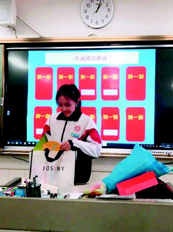 高三2班班主任张老师特地穿上了旗袍,并为学生们准备了向日葵祝福学生“旗开得胜、一举夺魁”。她说道:“我希望同学们能珍惜最后这几天的时光,在高考中发挥出自己理想的成绩!”
