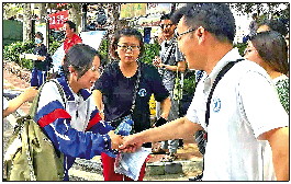 济南一中送考老师张乐与高考生握手。