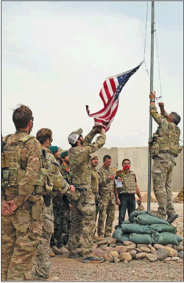 5月2日,美军士兵在阿富汗赫尔曼德省一处军事基地降下美国国旗。 新华社发