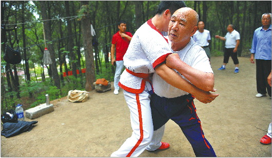 马老先生年近八旬,给年轻人指导起动作来依然强劲有力。