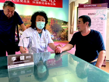 在曙光中医院,以院长原丰浩、内科专家李健等老党员带头组织的党员义诊服务队,已经成了医院最红的“偶像团体”。老党员做了引领示范,医院的年轻医护也都热情满满。每次义诊,曙光的医护人员都是早早到了现场准备。听闻是党员大夫,还是专家亲诊,社区居民往往热情高涨。专家们现场问询病情,并赠予免费艾灸治疗卡等,整个义诊场面非常温暖。