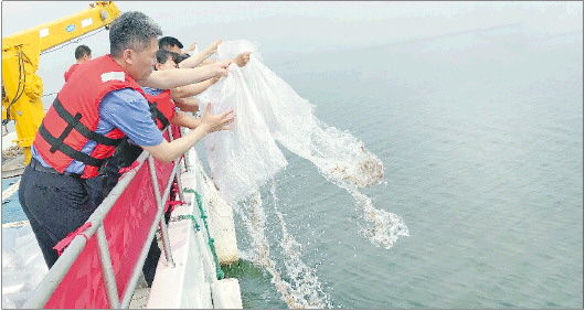 图为烟台市人民检察院和莱州市人民检察院工作人员投放鱼苗。 齐鲁晚报·齐鲁壹点记者 钟建军 摄影报道