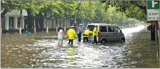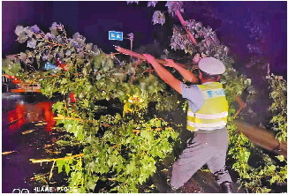 在雨中,执勤交警坚守一线,消除路障,及时给风雨中需要帮助的群众和车辆提供帮助,为群众提供安全畅通的交通环境。警方提醒,恶劣天气尽量减少不必要的出行,路遇暴雨、大风等极端天气,及时躲避,注意交通安全。 (通讯员 刘娜娜)