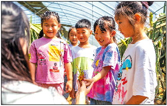 ◤防山镇钱家村劳动实践基地里,志愿者为孩子们介绍火龙果的“长成记”。
