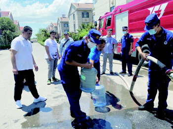 “炎炎夏日用不上水,这滋味儿真不好受。”近日,即墨区文峰路因道路整修,导致自来水管道破裂暂停供水,附近小区居民日常生活用水成了困难,请求消防部门支援。即墨区消防救援大队了解情况后,立即组织振中街消防救援站出动1辆水罐消防车义务为停水区域的居民小区送水。