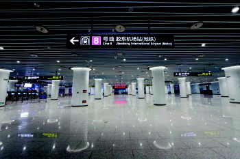 在高地铁站房内,高铁集散厅与地铁站厅整体联通,并与GTC换乘厅形成综合换乘大厅,通过这一平台,高铁、地铁与航站楼之间可实现无缝换乘,旅客可以从GTC通过连廊直接步行至机场大厅,极大地缩短旅客的出行时间。“一站式”的设计,使青岛胶东国际机场成为集高铁、地铁、高速、机场等多种方式于一体的全通型、立体化、零换乘综合交通枢纽。