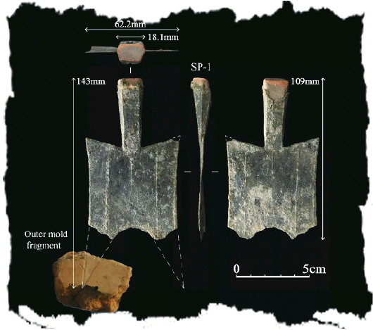 ▲河南荥阳官庄遗址出土的标号SP-1号空首布币成品。