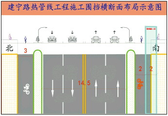 济南热力集团有限公司于2021年8月27日——9月11日,在建宁路(黄河路桥宿舍至经十一路规划C-X地块)进行热力管道施工,工期15天。整体采用全封闭围挡施工,围挡南半幅1米非机动车道及人行道作为施工区域;局部路口、横穿、分支施工均采用夜间施工时段,施工时间节点为晚上10:00-次日早上06:00,白天施工区域恢复通行。请过往车辆注意绕行,施工期间给周边居民带来不便,敬请谅解。施工位置及围挡横断面布局如右图所示。 济南热力集团有限公司