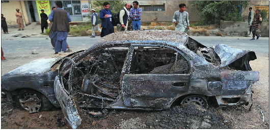 8月30日在喀布尔拍摄的一辆毁坏的汽车。这辆车内部装有火箭弹发射装置,当日发射火箭弹后被毁。 新华社发