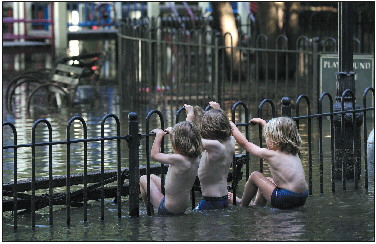图为儿童在水淹的公园里爬上栅栏。IC photo