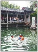 图②:2003年9月6日,三名员工将覆盖趵突泉喷泉口的石板等物取出,一轮泉水水纹缓缓出现。