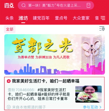 本次活动为潍坊市妇联发起,齐鲁晚报·齐鲁壹点承办,除了在齐鲁壹点APP上获得较好反响外,活动还在其他社交媒体及线下社群中引发互动。潍坊市民刘女士说:“我身边有好多朋友都参与打卡了,还有人‘炫耀’自己发布的内容得到了很多点赞,朋友圈里也有不少人转发。”她告诉记者,大家的参与度都很高,分享幸福的难度也低,“就跟发朋友圈似的,能发照片也能发视频。”