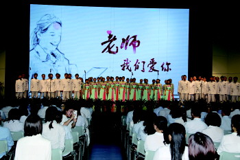 今年青岛市教育局首次提出设置教师节礼遇。在第37个教师节庆祝会上,五十八中在从教20年以上的老师中评选出了8位“教师楷模”。从教39年的朴贞花老师位列其中。