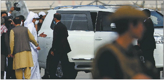 ◥9月12日,卡塔尔副首相兼外交大臣阿勒萨尼(白衣)抵达阿富汗喀布尔机场后乘坐专车。 新华/法新