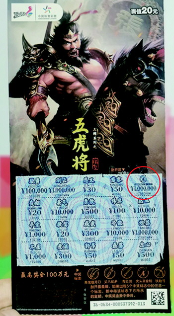 本次新上市的“五虎将”即开票是中国传统文化三国系列产品,票面重现三国英雄人物:关羽、张飞、马超、黄忠、赵云五位上将,飒爽英姿,唤醒每个人回忆中的三国印象。票面精美绚丽,观赏性、收藏性兼备。不仅如此,“五虎将”即开票本身还有更多惊喜,面值20元,20次中奖机会,玩法采用“找中奖符号”玩法,中奖奖金兼中兼得,简单有趣,最高可中100万元。