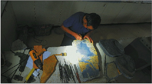 走进这简易的制作间,一边是创作和雕刻的工作台,一边是抛光水洗槽,地上满是雕刻后的碎石和粉尘。王开全正在屋角处雕刻一方徐公砚,他戴着花镜用刻刀一寸一寸地描绘着砚台在他心中的模样。王开全说:“每一方砚台都有自己的大小和形状,我要根据不同的石材勾画出图画,这方砚台已经刻了两个月了,马上就要完工,剩下的还要抛光、精洗,再用棉布反复擦拭。把石头刻出灵魂,才能成为徐公砚。”另一边他的大儿子正拿着一块看着极其普通的石头“相面”,王开全说那是他在构思雕刻图样,一块普通的徐公石在雕刻者手里拿起来放下,再拿起来反复琢磨,有时要几天或几周时间,一旦灵感来了,马上画出草图,着手雕刻。雕刻是个拼体力和细心的工作,更重要的是要耐得住寂寞。水槽边王开全的小儿子用最细的砂纸小心打磨着一方金星砚。屋外帆布下盖着一堆看着极其普通的石头,王开全说这就是徐公石。
