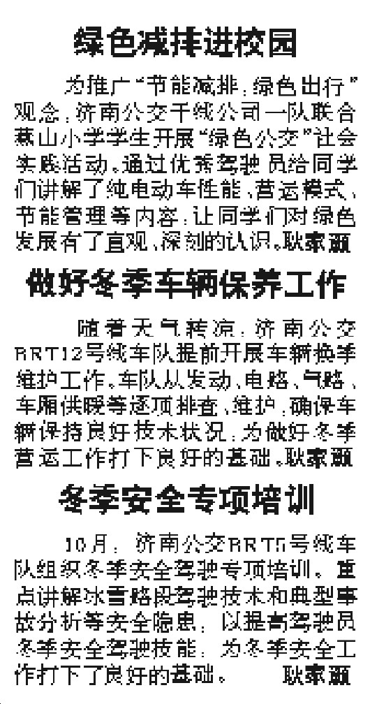 10月,济南公交BRT5号线车队组织冬季安全驾驶专项培训。重点讲解冰雪路段驾驶技术和典型事故分析等安全隐患,以提高驾驶员冬季安全驾驶技能,为冬季安全工作打下了良好的基础。 耿家灏