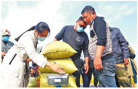 10月28日上午,潍坊市寒亭区禹王湿地的十万亩海水稻种植基地举行测产仪式。经测量,2021年该基地2.51万亩海水稻平均亩产691.6公斤,和2019年536公斤、2020年625.3公斤相比,亩产创下新高。2019年,海水稻伴随着袁隆平院士团队“中华拓荒人计划”从青岛来到潍坊,改变了寒亭区禹王湿地内几百年来的传统农业模式,这里一跃成为全国面积最大的海水稻种植基地,2.51万亩盐碱地成了丰收田。小图为工作人员正将收获的稻谷过磅。