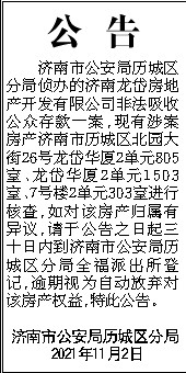 公 告 济南市公安局历城区分局侦办的济南龙岱房地产开发有限公司非法吸收公众存款一案,现有涉案房产济南市历城区北园大街26号龙岱华厦2单元805室、龙岱华厦2单元1503室、7号楼2单元303室进行核查,如对该房产归属有异议,请于公告之日起三十日内到济南市公安局历城区分局全福派出所登记,逾期视为自动放弃对该房产权益,特此公告。 济南市公安局历城区分局 2021年11月2日