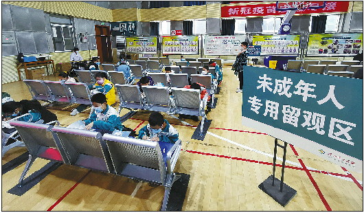 “回去后要清淡饮食,好好休息,避免过度运动和劳累,收好知情同意书底联,按期接种第二针。”完成接种后,五环体育场接种点护士向孩子们嘱咐注意事项。当日,该接种点开启4条接种通道,其中3条学生接种通道,1条成人第三针接种通道。学生们经过测温、登记后方可接种,完成接种后进入留观区。在老师的协调下,接种过程有条不紊,相较于成人接种,儿童接种速度较慢。但有意思的是,留观区的孩子们把课本放在座椅上,席地而坐,看起书来。
